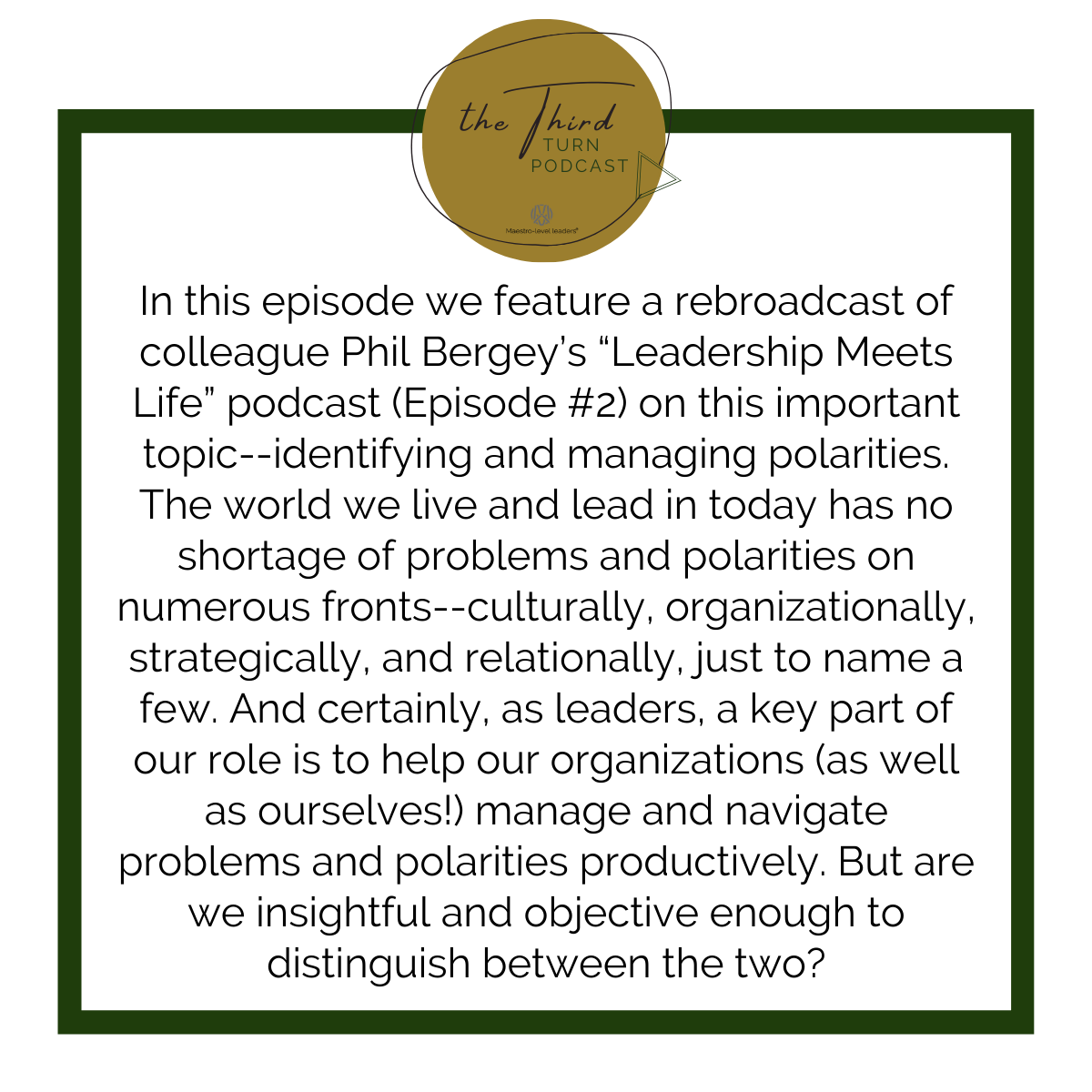 The Maestro-level leader is entering the third turn of a journey; this is where our conversations will flow as a resource for accomplished leaders who intend to soar toward that future.
